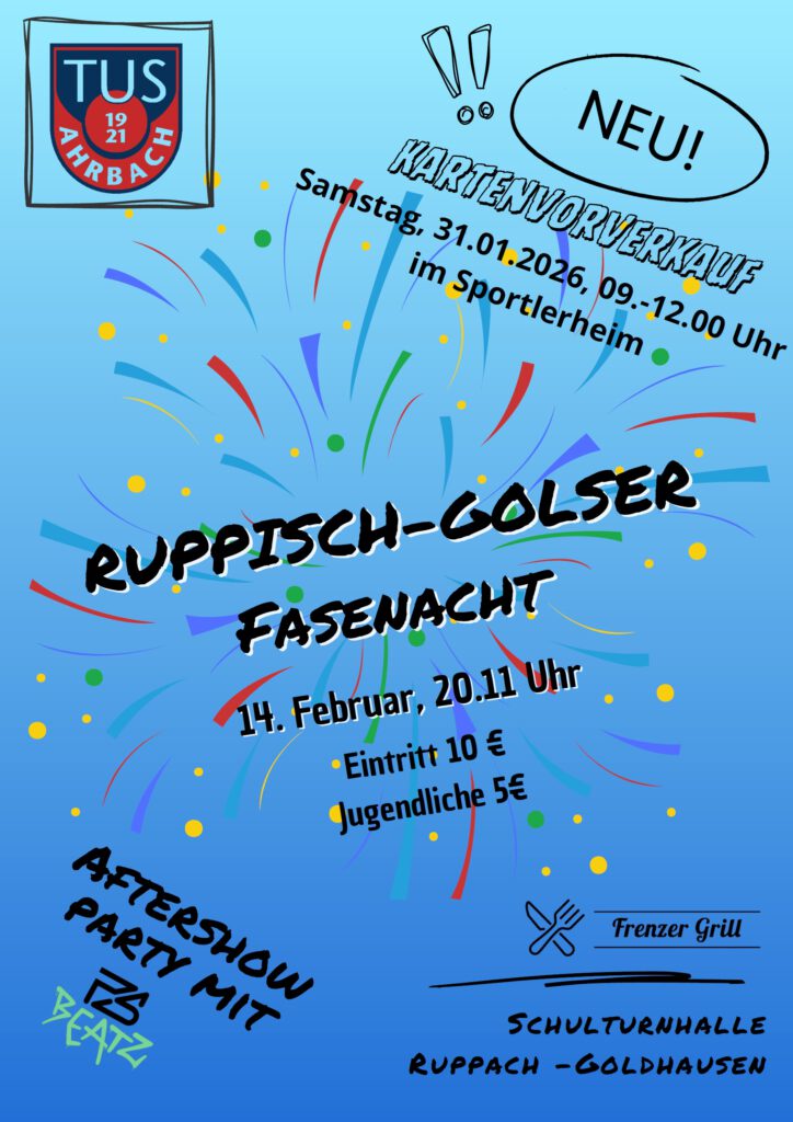 Samstag, 14.02.2026 - 20:11 Uhr Schulturnhalle Ruppach-Goldhausen AfterShow-Party mit PS BEATZ - Essens-Bewirtung: Frenzer Grill Kartenvorkauf: Samstag, 31.01.2026 - 9:00 bis 12:00 Sportherheim Ruppach-Goldhausen Eintritt: 10 €, Jugendliche 5 €
